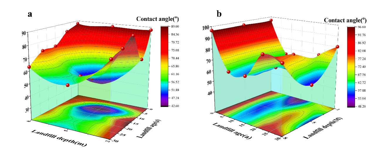 通过图5可以看出,在5m填埋深度下,PE(聚乙烯)塑料的接触角在填埋年龄为13年和15年时变化最大。从空间分布来看,PE废塑料的接触角呈漏斗状递减,且越接近5m深度变化速率越快。然而,PP(聚丙烯)废塑料表现出不同的趋势:首先,接触角在2m深度和15年填埋年龄、5m深度和30年填埋年龄,以及12年填埋年龄时变化最大;其次,其变化趋势呈现条纹状波动,但最大变化值仍出现在5m深度和13年及15年填埋年龄。可以预测,填埋场5m深度的接触角变化最大,这可能与其高含水量密切相关。