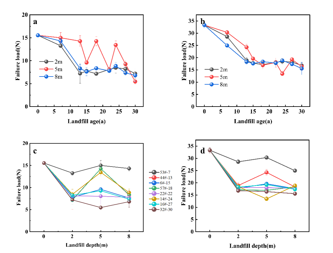 图5,塑料废弃物的断裂负载随时间的变化:(a) PE随填埋时间的变化 (b) PP随填埋时间的变化 (c) PE随填埋深度的变化 (d) PP随填埋深度的变化