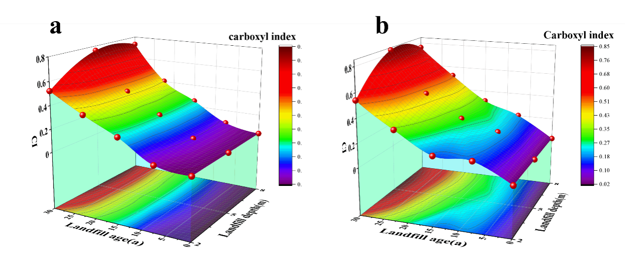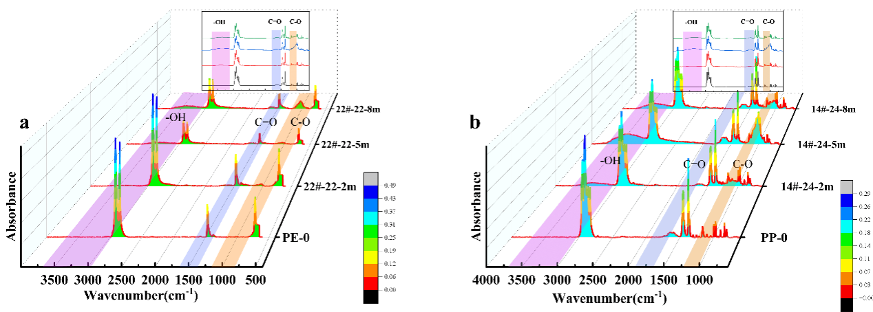 聚丙烯(PP)和聚乙烯(PE)是填埋塑料的主要成分。随着填埋时间的增加,塑料的老化程度加剧,表现为羰基指数(CI)和羟基指数(HI)的增加。