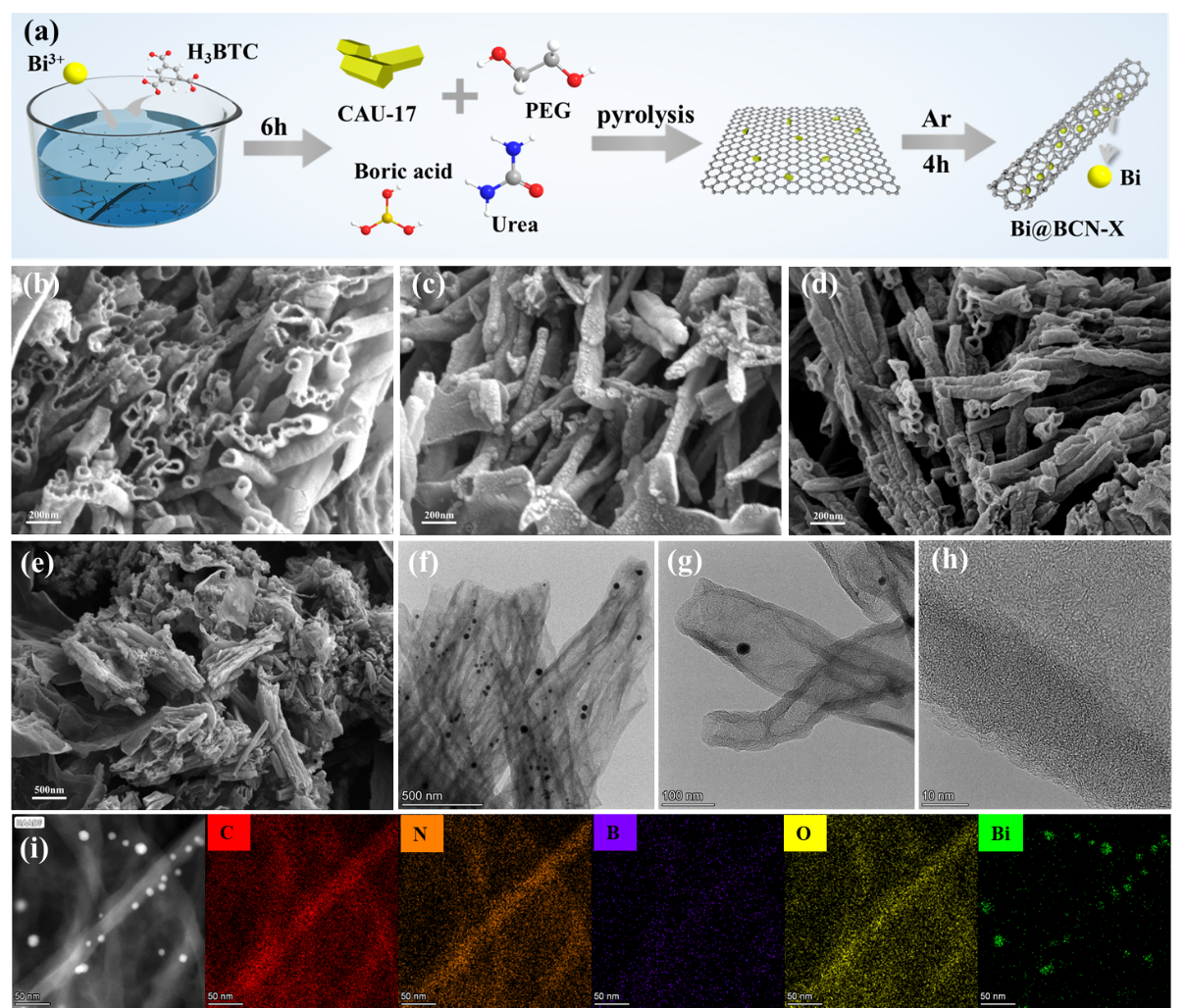 图1(a) Bi@BCN-X的合成示意图;(b) Bi@BCN-700、(c) Bi@BCN-800、(d) Bi@BCN-900和 (e) Bi@BCN-1000的SEM图像;(f-h) Bi@BCN-900的TEM图像及 (i) HAADF图像。