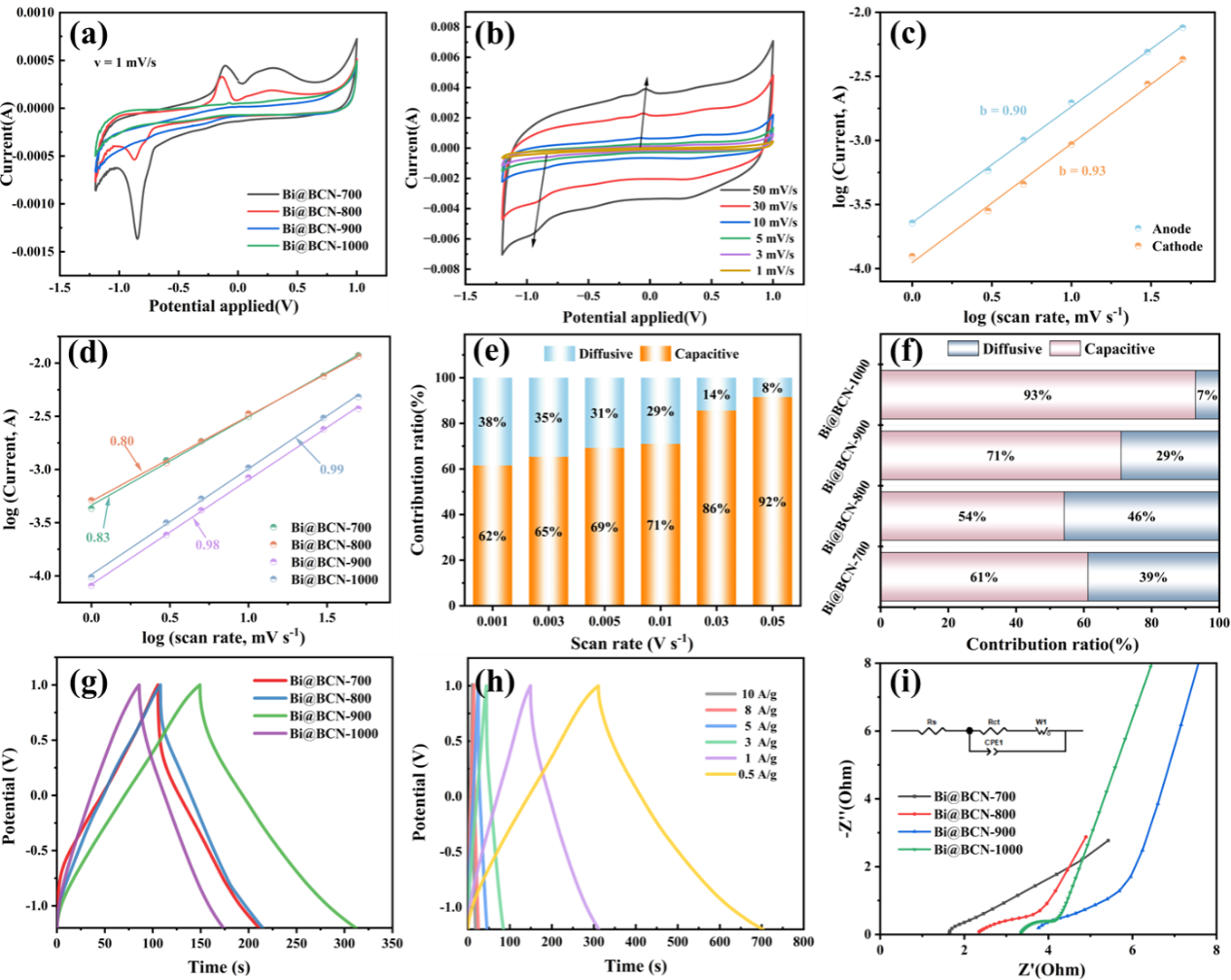 图3 (a)Bi@BCN-X在1 mV s-1扫速下的循环伏安曲线;(b)Bi@BCN-900在不同扫速下的CV曲线;(c)Bi@BCN-900峰电流与扫速间的幂律关系;(d)Bi@BCN-X峰电流与扫速间的幂律关系;(e)Bi@BCN-900在不同扫速下扩散/电容贡献对比;(f)Bi@BCN-X在10 mV s-1扫速下扩散/电容贡献的对比;(g)Bi@BCN-X在1 A g-1电流密度下的恒流充放电曲线;(h)Bi@BCN-900在不同电流密度下的GCD曲线;(i)Bi@BCN-X基于电化学阻抗谱(EIS)测量的奈奎斯特图,频率范围从100 kHz 到0.01 Hz。