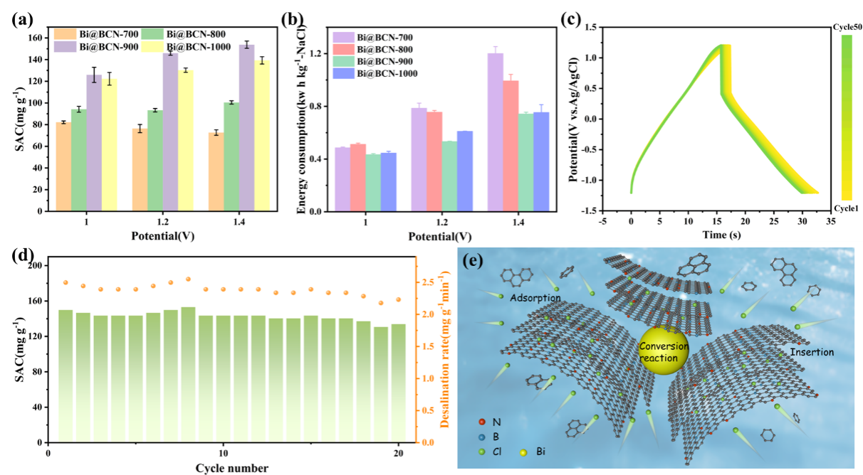 图4 Bi@BCN-X在不同电压下的(a)脱氯能力和(b)能耗比较;Bi@BCN-900的(c)GCD长循环试验和(d)脱氯长循环试验;(e) Bi@BCN-900电极脱盐机理图。