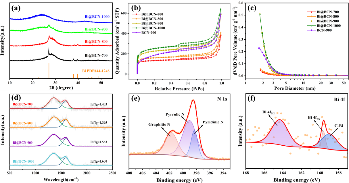 图2(a) Bi@BCN-X的XRD图谱;Bi@BCN-X和BCN-900的(b) N₂吸脱附等温线h和(c)孔径分布;(d) Bi@BCN-X的拉曼光谱;(e) Bi@BCN-900的N1s XPS谱图;(f) Bi@BCN-900的Bi 4f XPS谱图。