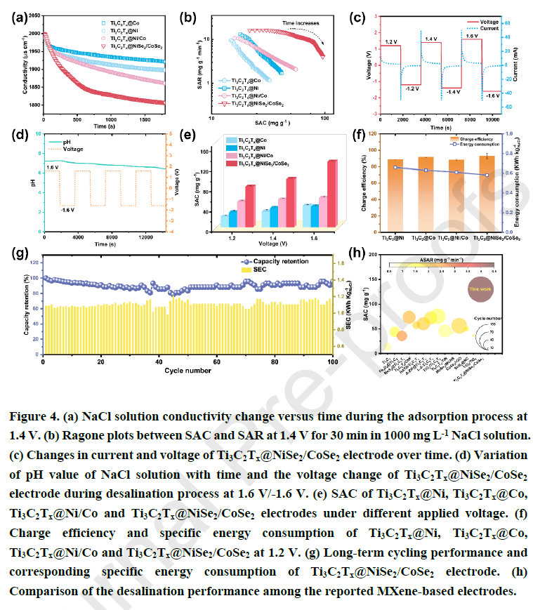 ●探究了Ti₃C₂Tₓ@NiSe₂/CoSe₂电极的电容去离子效能和离子存储机制。