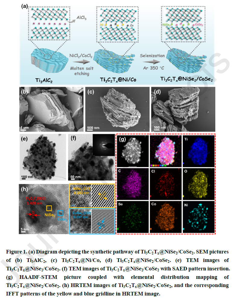 SEM和TEM分析可知,熔盐刻蚀成功将Ti3AlC2中Al层去除,得到类手风琴状Ti3C2。硒化后,NiSe₂/CoSe₂纳米颗粒均匀地锚定在Ti3C2的层间和表面。Ti₃C₂Tₓ@NiSe₂/CoSe₂中观察到Ti₃C₂Tₓ、NiSe₂及CoSe₂的晶体结构。