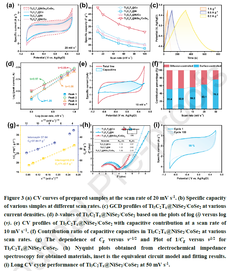 所有样品的CV曲线形状都呈现类矩形,没有明显的氧化还原峰,表明电极的离子存储机制以插层赝电容为主。Ti₃C₂Tx@NiSe₂/CoSe₂始终具有最优电容性能和容量保持率,这得益于Ti₃C₂Tx中均匀分布的NiSe₂/CoSe₂混合金属硒化物纳米颗粒提供的丰富的高化学活性位点,同时,Ti₃C₂Tx@NiSe₂/CoSe₂扩展的层间距和分级孔结构也进一步增加了活性位点可及性和利用率。
