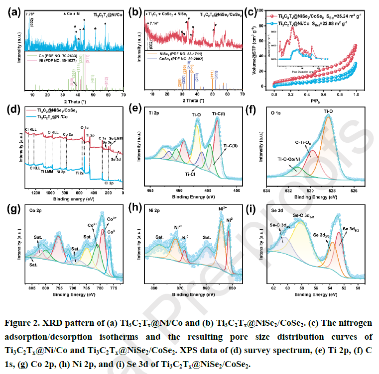 Ti₃C₂Tx@NiSe₂/CoSe₂中显示出NiSe2(PDF编号88-1711)和CoSe2(PDF#89-2002)的特征衍射峰,证实了NiSe2和CoSe2在Ti3C2Tx中原位衍生成功。NiSe2/CoSe2纳米颗粒在Ti3C2Tx层间的分布进一步增大了其层间距和比表面积。XPS分析表明,NiSe₂/CoSe₂与Ti₃C₂Tx通过Ti-O-Ni/Co键耦合。强界面作用可显著促进界面电子转移,增强材料整体的导电性。