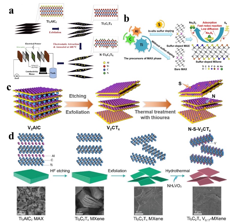 图5(a) N-Ti₃C₂Tₓ MXene片的合成及其在CDI电极中的应用;(b) 硫掺杂 MXene 的制备过程示意图,以及在多硫化物穿梭过程中硫掺杂 MXene 正极加速和最小化钠基放电的作用;(c) N、S共掺杂V₂CₓTₓ MXene的合成工艺示意图;(d)钒掺杂Ti₃C₂Tₓ MXene纳米片的水热制备过程及其相应的SEM图像。