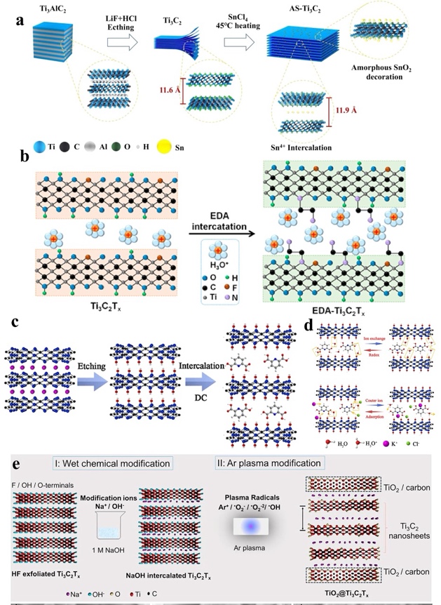 图4(a) AS-Ti₃C₂复合材料的合成路线示意图;(b) Ti₃C₂Tₓ和EDA-Ti₃C₂Tₓ中水合电解质离子的电荷存储示意图;(c) MXene-DC 的制备过程示意图;(d) MXene-DC/KCl 的电荷存储机制示意图;(e) MXene Ti₃C₂Tₓ的湿化学和等离子体改性示意图。
