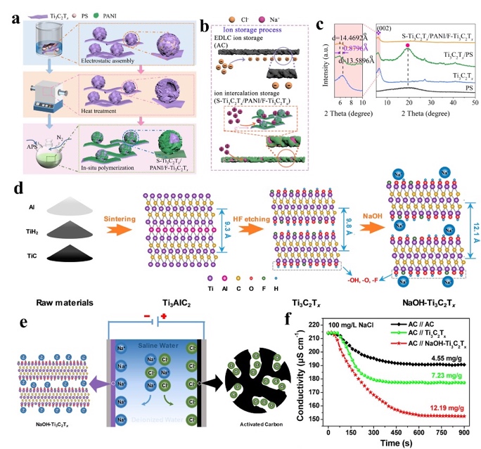 图3(a) S-Ti₃C₂Tₓ/PANI/F-Ti₃C₂Tₓ的合成流程示意图;(b) EDLC 的储存容量及电极的离子嵌入情况;(c) 不同样品的 XRD 图谱;(d) NaOH-Ti₃C₂Tₓ的合成过程示意图;(e)非对称CDI电池(AC // NaOH-Ti₃C₂Tₓ)的示意图;(f)在100 mg L⁻¹ NaCl溶液中,AC // NaOH-Ti₃C₂Tₓ、AC // Ti₃C₂Tₓ和AC // AC的电导率曲线。