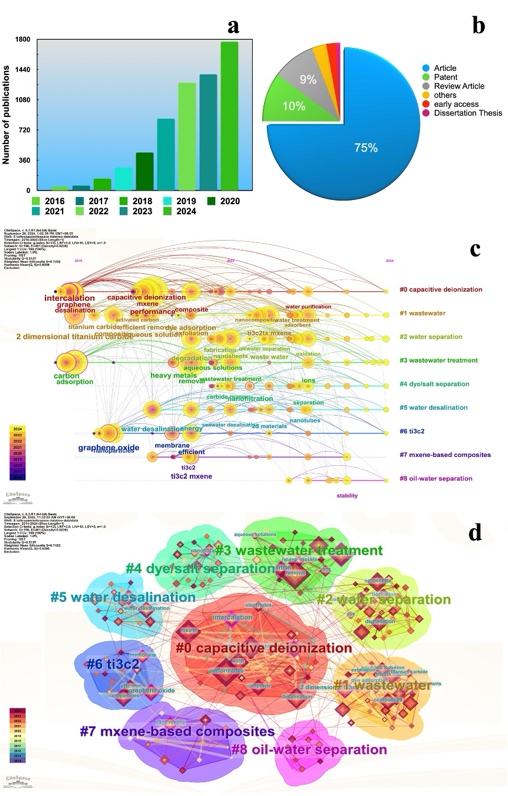 图1. (a) 2016年至2024年间关于MXenes及其环境应用的发表数量;(b) 不同类型的分布情况。数据通过Web of Science获得,检索条件为((主题 = MXene) 且 (主题 = Adsorption 或 Membrane, Capacitive deionization, Catalytic, Catalysis)) 或 ((主题 = MXene) 且 (主题 = Wastewater 或 Degradation, Pollutant));(c) 代表性11个关键词的共引文献聚类视图;(d) 2016年至2024年的时间线相关性。