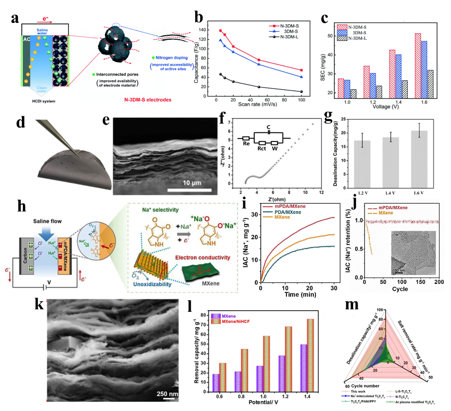 图7(a) HCDI 单元工作原理示意图及这种 N 掺杂 MXene 互联球壳作为脱盐电极的典型潜在优势;(b) 不同扫描速率下 N-3DM-S 与对照样品(N-3DM-L 和 3DM-S)的比体积变化趋势;(c)在初始浓度为5000 mg L⁻¹条件下,不同电压下N-3DM-S、N-3DM-L和3DM-S电极的SEC比较;(d)独立Ti₃C₂Tₓ膜;(e)独立Ti₃C₂Tₓ膜横截面的SEM图像;(f) 不同电流密度下的 Nyquist 图;(g) 不同电压窗口下的能耗和能量回收率;(h) mPDA/MXene基CDI工艺电极在材料IAC(Na⁺)中表现出的抗氧化性、高面内电导率及Na⁺离子选择性;(j) mPDA/MXene 与 MXene 在 500 ppm (8.55 mM) NaCl 溶液中的循环性能;插图为 mPDA/MXene 在 CDI 循环后的 TEM 图像;(k) MXene 膜的 SEM 图像;(l)不同电压下MXene与MXene/NiHCF膜的脱盐容量(500 mg L⁻¹);(m) 与 MXene 相关的材料.