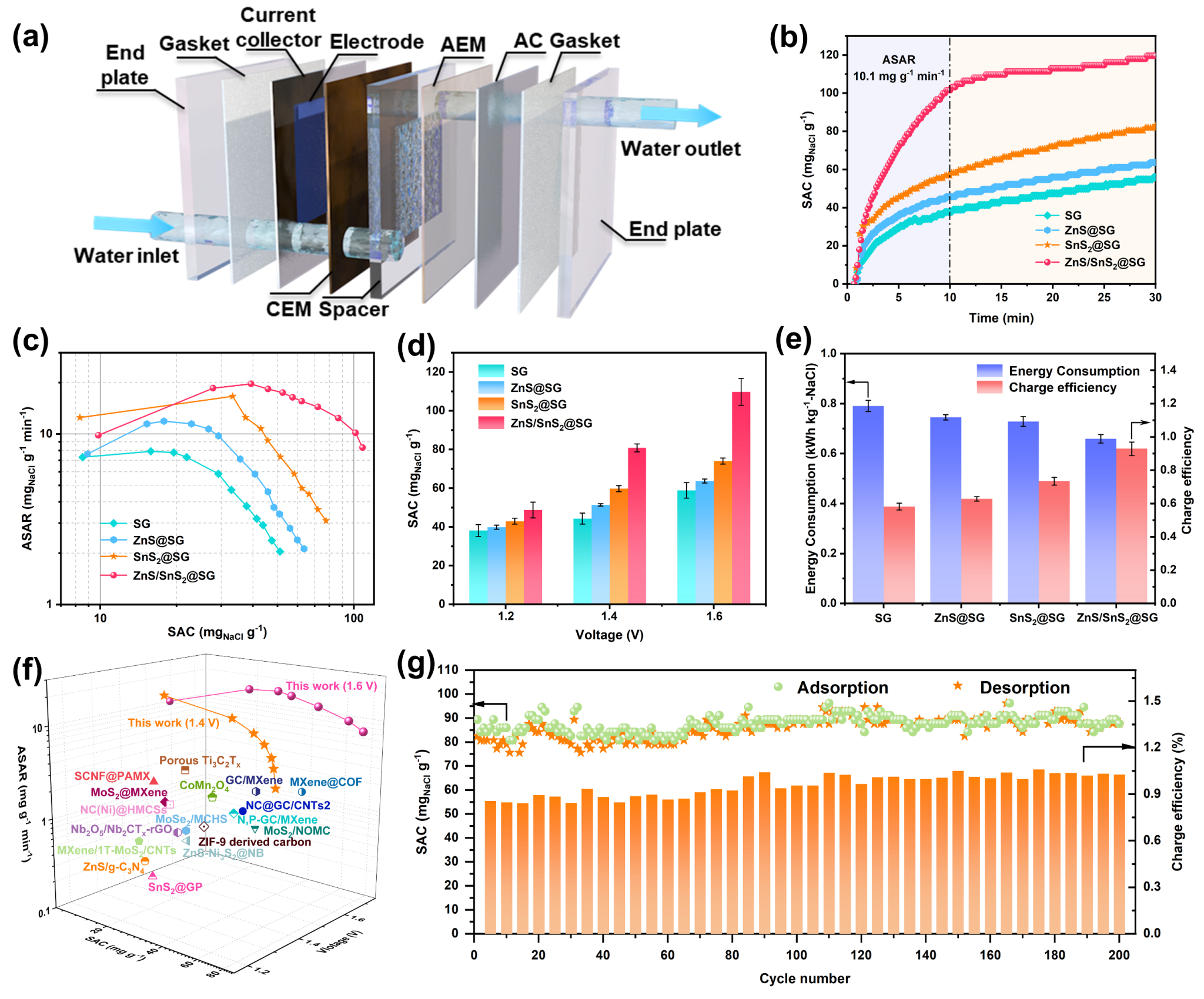 CDI测试表明,ZnS/SnS2@SG电极展现了109.7 mg g-1的脱盐容量、3.65mgg-1min-1的平均脱盐速率,0.65kWh kg-1-NaCl的低能耗, 200次循环后的容量并没有明显衰减,远高于SG、ZnS和SnS2。这些结果有力地证明了ZnS/SnS2@SG在脱盐中具有高性能、稳定和低能耗的优势。