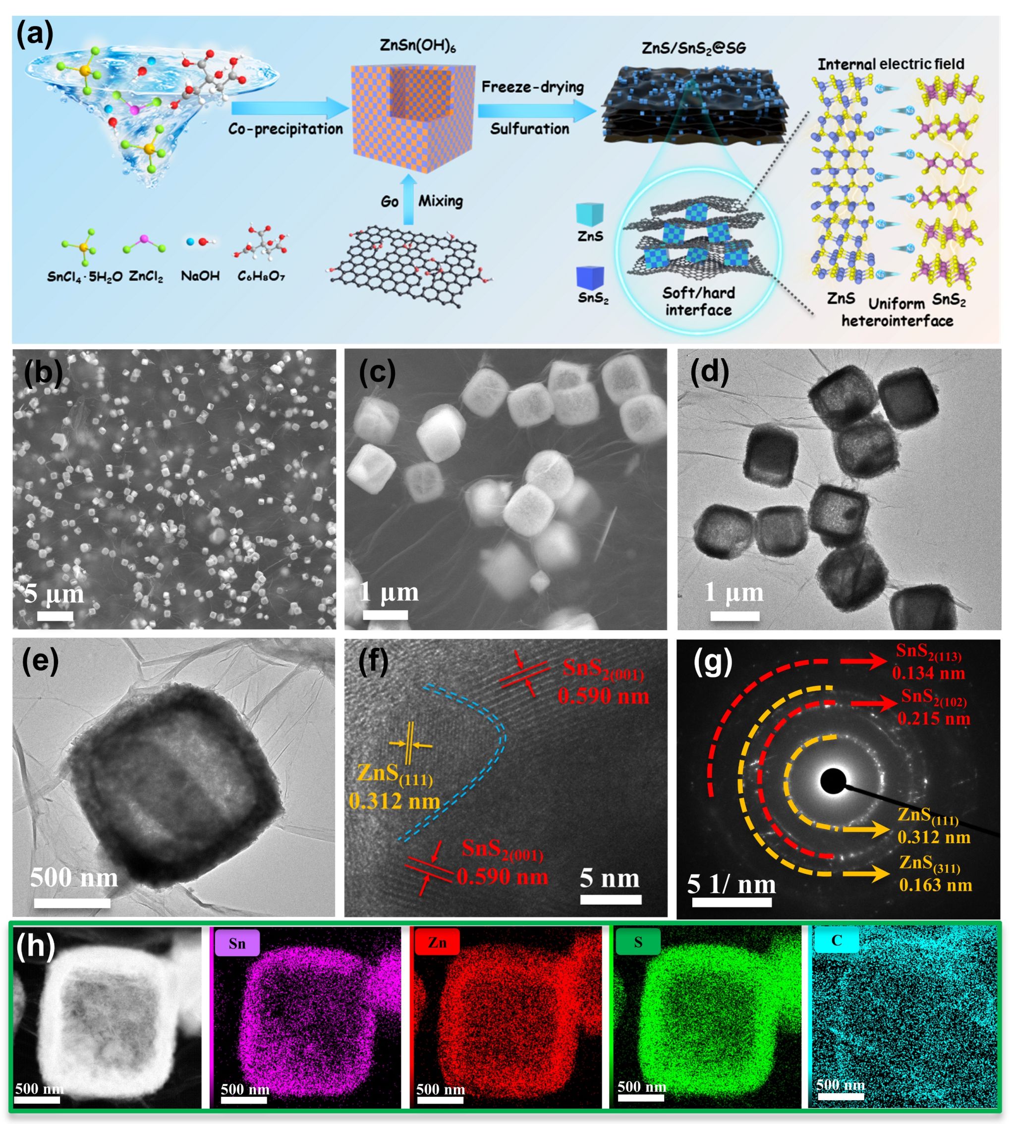 通过自模板法和原位高温硫化合成了硫掺杂石墨烯包覆的ZnS/SnS2微盒。相关分析证实ZnS/SnS2@SG具有空心结构和丰富的异质结,有利于电解液的渗透和电荷转移。EDS元素映射显示,Sn、Zn和S元素在空心立方体中均匀分布。