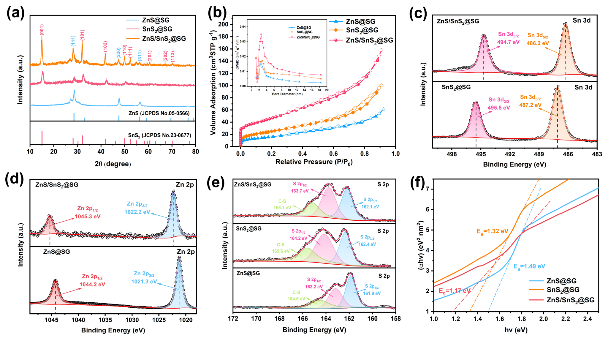 XRD和XPS测试证明了ZnS/SnS2@SG的成功合成。BET结果则表明ZnS/SnS2@SG具有较高的比表面积和合适的孔径分布,有利于增加电化学活性区域和位点并保证快速高效的Na+存储。UV-vis光谱测得ZnS/SnS2@SG具有最小的带隙值,表明内电场可以有效地减小带隙,显著提高本征电导率。