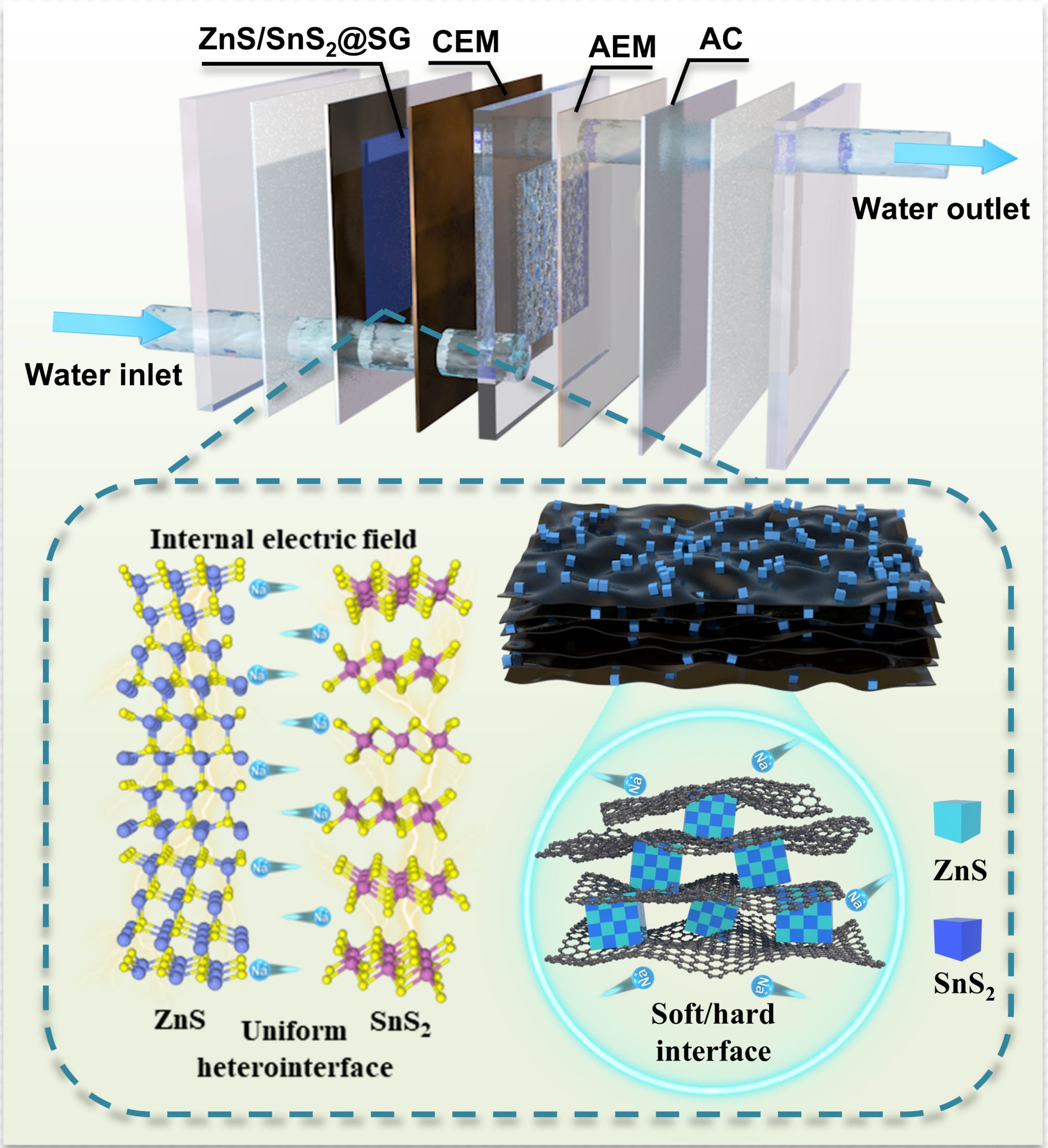 过渡金属硫化物(TMS)是一类新兴的功能纳米材料,其中SnS2以其快速离子插层和高电化学容量脱颖而出。然而,固有低电子导电性和急剧的体积膨胀,导致不良的速率性能和严重的容量衰减。已经通过构建精细纳米结构和缺陷工程等方法来解决这些短板,但颗粒团聚和缺陷浓度控制等问题仍困扰着电极性能。因此,需要独特的结构设计与合成策略以有效缓解SnS2的性能缺陷。有鉴于此,同济大学马杰教授、李新贵教授和上海海洋大学于飞教授合作,设计了一种具有“微-宏”观界面工程的ZnS/SnS2@SG多孔杂化网络,通过软硬界面和异质界面改善了电化学反应动力学并有效缓解长循环过程中的体积膨胀,展现了高容量、快速率、低能耗以及优异循环稳定性的盐离子去除性能。本研究展示的界面工程策略在指导下一代电化学离子捕获的材料创新方面显示出巨大的潜力。