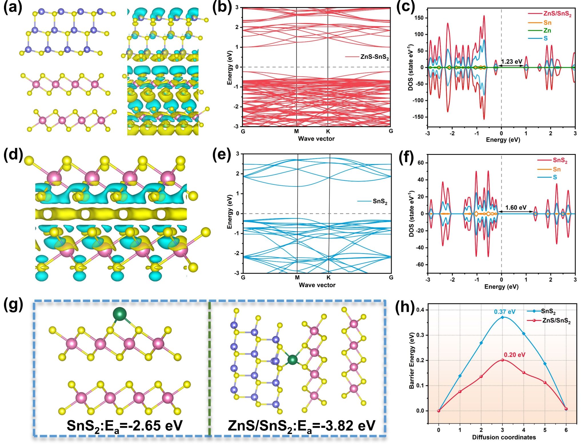 密度泛函理论计算表明ZnS/SnS2@SG对于Na+具有更强的吸附能,更低的扩散能垒。ZnS/SnS2异质结的电荷分布不平衡,电子倾向于从Zn–S键向Sn–S键转移,导致ZnS与SnS2之间形成强烈的界面电子耦合。ZnS/SnS2@SG的“宏-微”观界面工程不仅促进了Na⁺的快速动态插层过程,还提升了电导率和电化学容量,确保了卓越的脱盐性能和长循环稳定性。