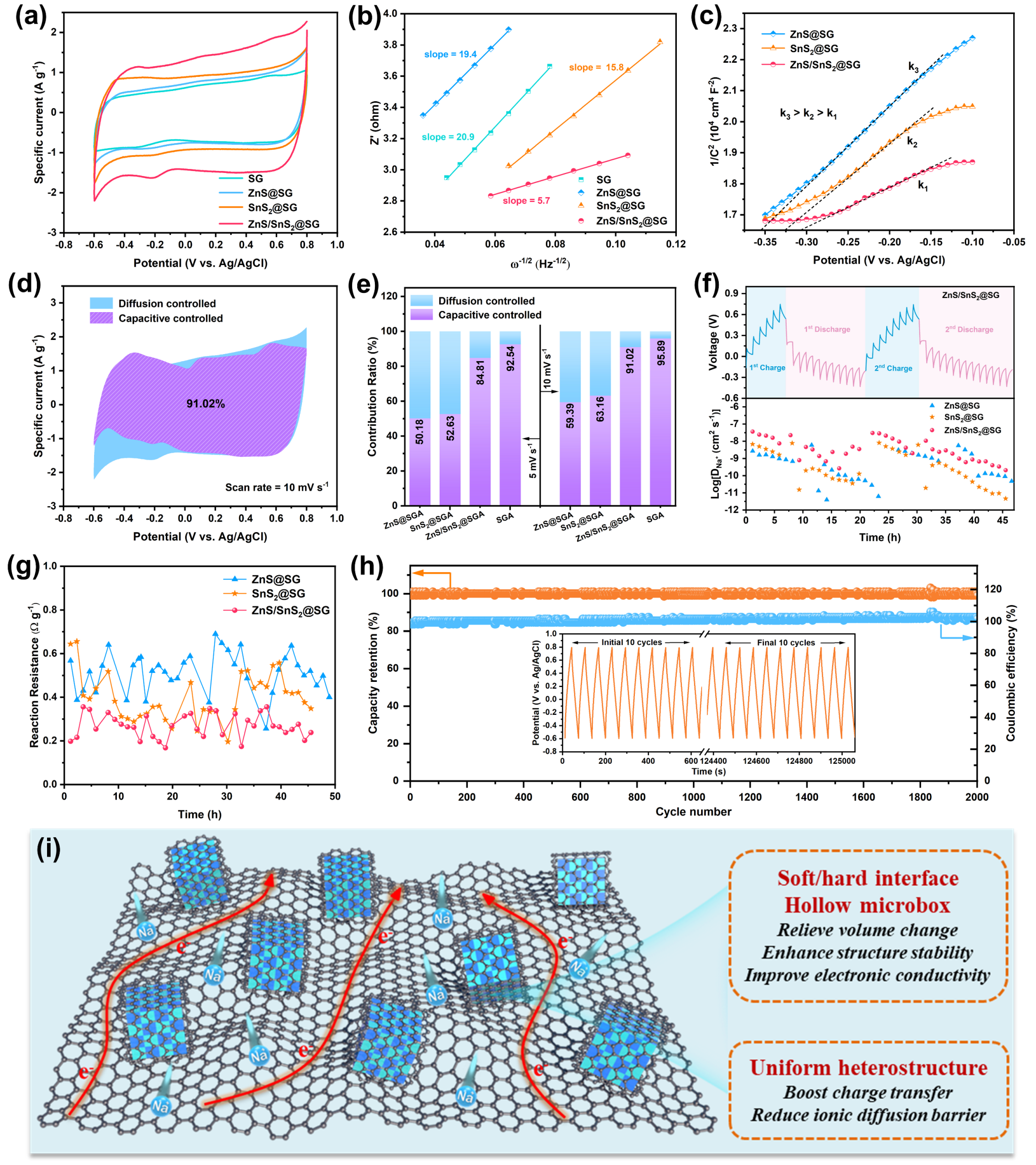 电化学测试中ZnS/SnS2@SG电极展现出优异的电化学容量和循环稳定性、更低的界面转移电阻、更高的电荷载流子浓度以及快速的离子扩散系数。