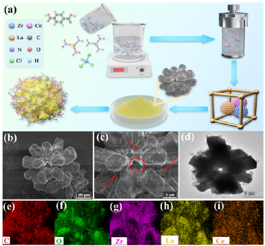 图1. The fabrication schematic, (b-c) SEM images, (d) TEM image, (e-i) EDS of Zr-La-Ce MOFs
