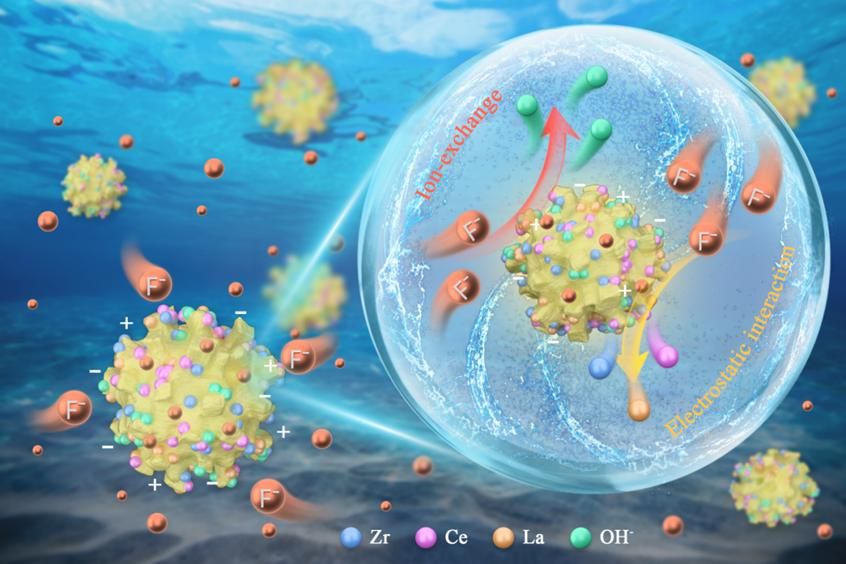 氟化物是一种不可生物降解、有害且持久的污染物,以多种形式存在于自然界中,广泛分布于动植物及环境中。全球约25个国家面临严重的氟中毒问题,尤其是在中国、印度、巴基斯坦、非洲、阿根廷和亚洲等湿润热带地区,地下水氟化物污染报道频发。氟是人体发育的关键元素,其通过饮用水、食物、药物和化妆品等途径摄入,适量浓度有益健康,但世界卫生组织(WHO)指出,当氟浓度超过1.5 mg/L时会危害健康。氟污染主要源于自然和人为活动,冶金、光伏、半导体和化肥生产等行业排放的废水中氟化物浓度常超1000 mg/L,远超安全饮用水标准,尽管许多工业会对其进行预处理,但是仍很难达到要求浓度,需深度处理以确保达标排放。目前处理方法包括吸附、化学沉淀、离子交换和膜技术等,其中吸附法因操作简单、材料易得、成本低和性能优异而广泛应用,但传统吸附剂如沸石、粘土和羟基磷灰石等存在吸附效率低、稳定性差和选择性不足等缺陷。金属有机框架(MOFs)因其可调孔隙结构、高比表面积和多样化组成在污水处理中备受关注。为进一步优化吸附剂性能,本研究借鉴低熵合金和高熵合金概念,通过一锅法合成Zr-La-Ce三金属MOFs,旨在确定最佳制备条件、评估其除氟性能(pH、初始浓度和共存离子等的影响)、探究吸附机理,并通过实际废水应用和再生性能测试探究其实际英语潜力,为多金属MOFs材料的制备与应用提供参考。