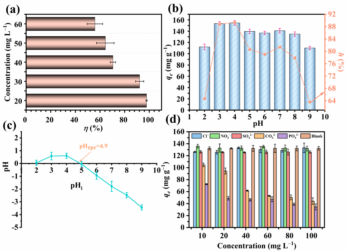 图2. Batch adsorption: (a) impact of initial fluoride concentration (CF-=20-60 mg L−1, pH=4, t=6 h, m/V=0.2 g L–1), (b) influence of pH (CF-=20 mg L−1, t=6 h, m/V=0.2 g L–1), (c) analysis of pHzpc(CNaCl=0.1 mol L−1, t=6 h, m/V=0.2 g L–1), and (d) impact of co-existence ions (CF-=20 mg L−1, t=6 h, m/V=0.2 g L–1, pH=4)