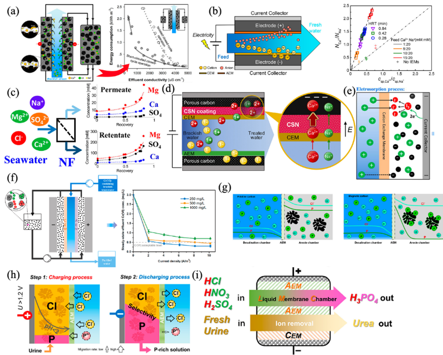 图 3.选择性离子去除的不同机制:(a) 通过受控操作选择性去除 Ca2+ 离子。(b-d)基于不同价离子的膜亲和形成的选择性。(e) 向流动电极添加氧化还原对。(f) 低电流密度下的选择性。(g) 通过磁性电极与目标污染物形成复合物。(h-i)由充电和放电过程控制的选择性资源回收。