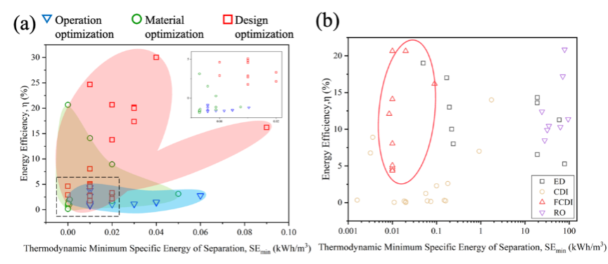 图1.(a)FCDI在结构优化、材料优化和操作优化,(b)不同的技术手段下的η vs. SE关系。