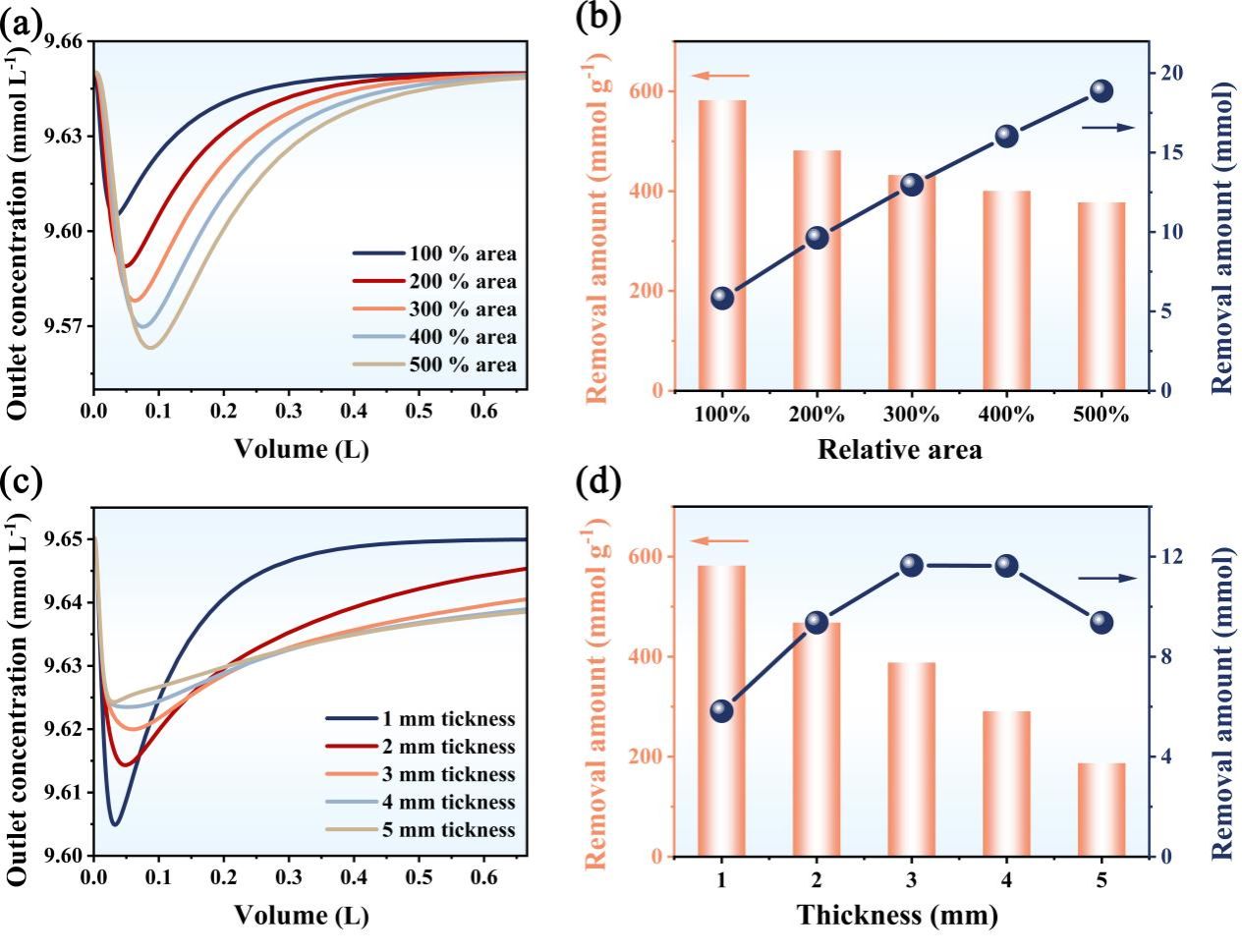 考虑到Cu@CHs的低廉成本,采用有限元模拟评估了材料在实际应用中合适的增量方式。图5a-b显示,将水凝胶的有效面积由100 %扩大至500 %,出水Cl-浓度持续下降,尽管单位质量去除量随面积增大而递减,但总去除量线性增加;图5c-d表明厚度由1 mm增至5 mm时,电场和离子耦合受阻,出水浓度升高,总去除量先升后降,3 mm达到最大值。综合比较,实际应用中扩展面积可能更优于增厚。