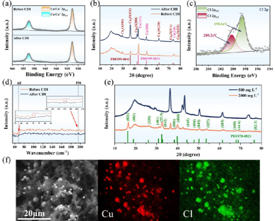 高分辨XPS(图4a)表明循环后Cu 2p谱未见Cu2+的特征峰,证实PVA层有效抑制Cu0/Cu+进一步氧化为Cu2+;XRD(图4b)显示放电后Cu衍射峰减弱、Cu2O峰增强,且晶格微量膨胀,表明Cl-掺杂可能取代了部分Cu2O的晶格氧。Cl 2p XPS(图4c)于198.6 eV和200.2 eV出现了间距为1.6 eV的双峰,符合Cl-嵌入Cu2O晶格形成Cl-Cu2O结构的特征;拉曼(图4d)新增68与196 cm-1Cu-Cl振动峰进一步证实了500 mg L-1的氯化钠浓度下,Cu2O对Cl-的存储方式是通过Cl取代了部分Cu2O的晶格氧形成Cl-Cu2O结构。当NaCl浓度提升至2000 mg L-1时,XRD(图4e)出现Cu2(OH)3Cl特征衍射,表明2000 mg L-1氯化钠浓度下,Cl-环境下Cu2O的储氯形式为与Cl-发生转化反应形成Cu2(OH)3Cl;SEM-EDS映射(图4f)显示Cl元素仅与Cu区域重叠,说明Cu基活性位点对Cl-具有专属选择性。