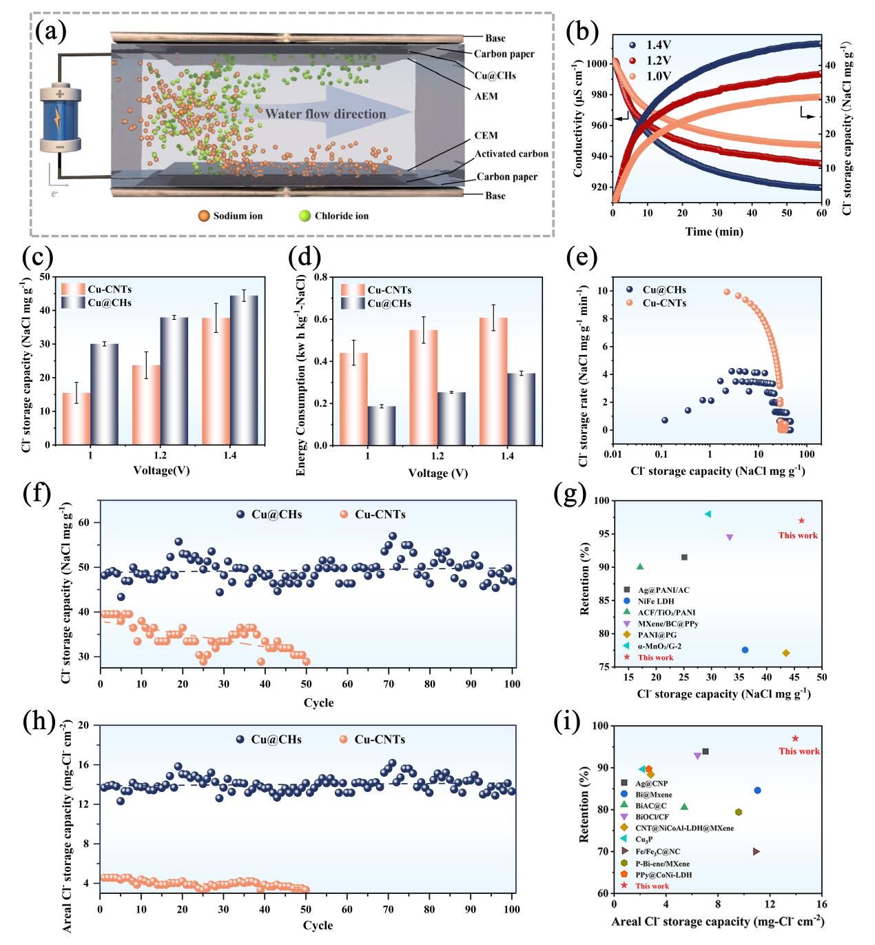 图3a为CDI装置示意图。图3b显示1.0–1.4 V梯度下Cl-储容量由30.1升至44.4 mg g-1。图3c-d的对比表明在Cu@CHs在各电压下的吸附容量和能耗均优于Cu-CNTs,这主要得益于Cu@CHs作为三维电极具有高储水能力,能够在结构内富集更多的离子,以及其制备过程中不添加粘结剂导致能耗较低。Ragone图(图3e)揭示水凝胶三维电极的吸附速率变化与传统的二维涂布浆液型电极有所不同,Cu@CHs初期速率低、中后期反超,平均速率更高。CDI长循环测试与电化学测试结果一致,证实了Cu@CHs通过PVA对铜成分的保护实现稳定的循环能力,以及Cu-CNTs中铜成分的溶解损失导致容量下降(图3f)。此外,三维电极由于质量相对较重,在单位材料质量的性能上与二维电极拉不开明显的差距,但在单位面积吸附性能上则表现出碾压的优势(图3g-i)。