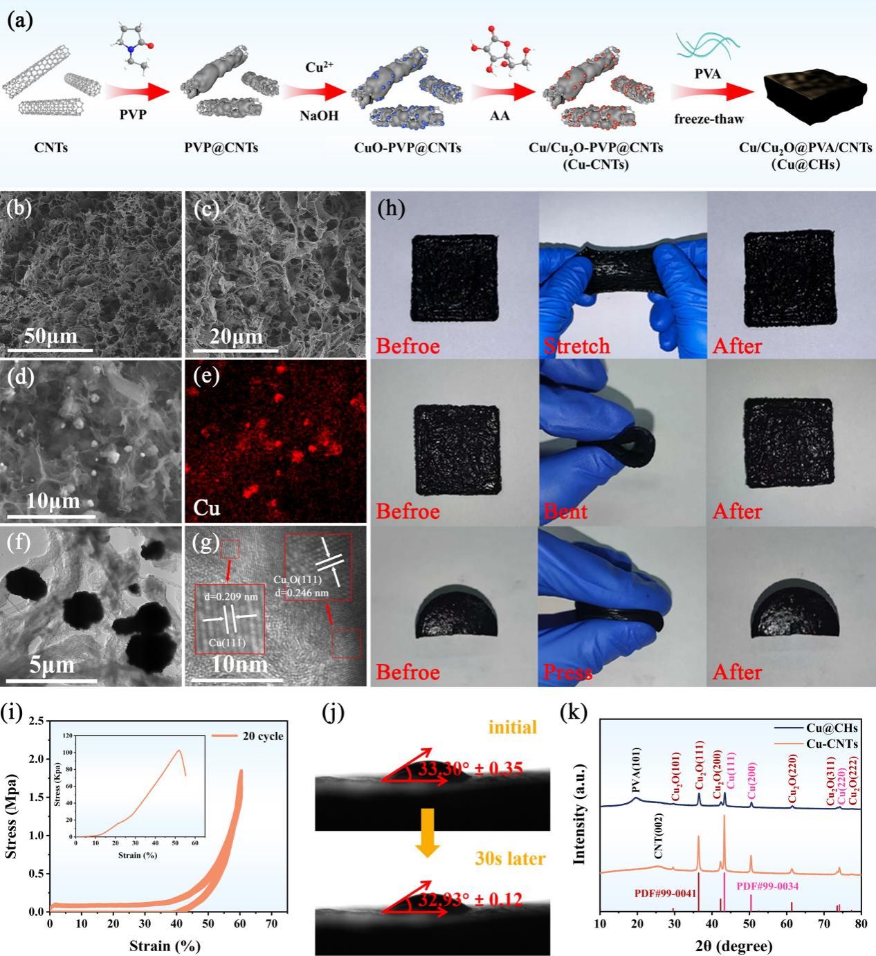 图1a为五步合成示意,展示PVP在CNTs表面的涂敷、Cu2+吸附-沉淀-还原、PVA包埋及反复冻融交联的连续工艺;图1b-c的SEM显示水凝胶材料经冻干后呈现互通蜂窝状三维网络,具有强大的储水、快速传质能力;图1d-e显示Cu/Cu2O颗粒呈“星罗棋布”式分布于水凝胶骨架网络中并附元素分布;图1f-g的TEM及高分辨像证实Cu与Cu2O共存;图1h-i展示水凝胶可拉伸、弯曲、压缩的优异宏观柔性,确保其在吸附水基污染物过程中还具有一定的抗水冲击耐力;图1j静态接触角测试显示PVA链上丰富羟基所致的高亲水性;图1k XRD证实复合材料中含Cu、Cu2O、PVA及CNTs晶相,结构完整。