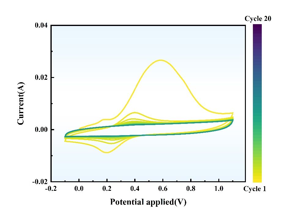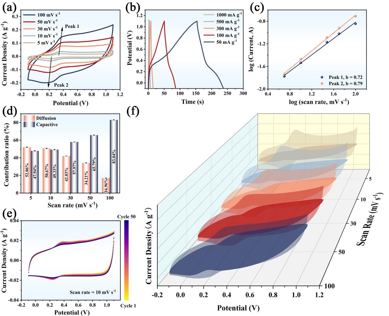 而不含PVA的Cu-CNTs电极在最初的几次循环中即快速丧失氧化还原活性(如上图),验证了PVA对铜成分的保护作用。图2f展示了不同扫速下电容、扩散的3D图,随着扫描速率的降低,CV曲线的氧化还原峰变得越来越明显,而电容占比部分虽面积逐渐减小但形状基本保持不变,表明不同的扫速可能对扩散过程影响更大。