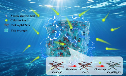 实现水中高稳定性、高容量氯离子选择性捕获是电容去离子技术走向工程化的关键,尽管Cu2O对氯离子具有高亲和性,但在电容去离子技术中作为阳极会面临材料氧化溶解导致性能下降的问题。在此,我们研发了一种三维自支撑的、负载Cu/Cu2O的聚乙烯醇/碳纳米管导电水凝胶电极用于吸附氯离子,利用PVA抗氧化功能抑制Cu/Cu2O向游离Cu2+的转变,同时借助CNTs作为锚定Cu/Cu2O原位生长的载体。所得水凝胶电极具有优异的吸附容量和较低的能耗,为含氯废水中氯离子的去除提供了经济可行的新路径。