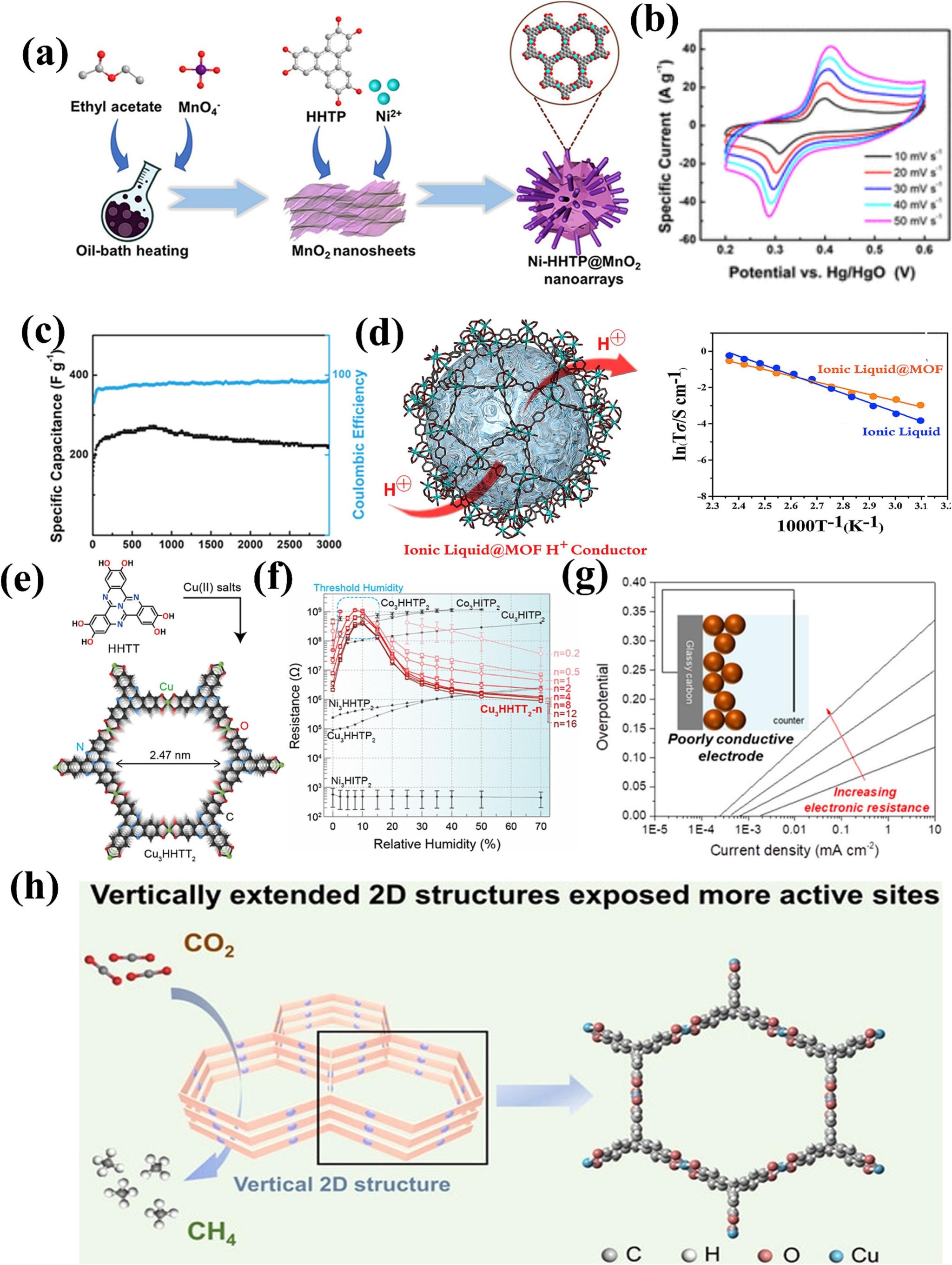 凭借高导电性和结构优势,C-MOFs在电化学领域展现出广泛应用。在超级电容器中,它们直接作为电极材料,其多孔结构利于离子快速传输,共轭骨架确保电子传导,并通过与赝电容材料复合或调控质子传导进一步提升容量与倍率性能。在燃料电池中,C-MOFs作为质子交换膜材料,通过其有序孔道和可设计的氢键网络实现高效质子传输,引入离子液体或进行碳化处理可显著提升其导电率与电池功率密度。在电化学传感器领域,C-MOFs的高孔隙率和导电性使其能直接作为敏感界面,充分暴露活性位点,实现对目标物的高灵敏、高选择性检测,其传导机制变化(如湿度引起的离子-电子传导转换)可直接转化为传感信号。在电催化方面,高导电性确保了电子向活性位点的快速传递,通过调控金属中心和配体可优化电子结构,降低析氧反应、二氧化碳还原反应等的过电位,构建特殊形貌(如垂直结构、空心纳米盒)还能增加活性位点暴露。