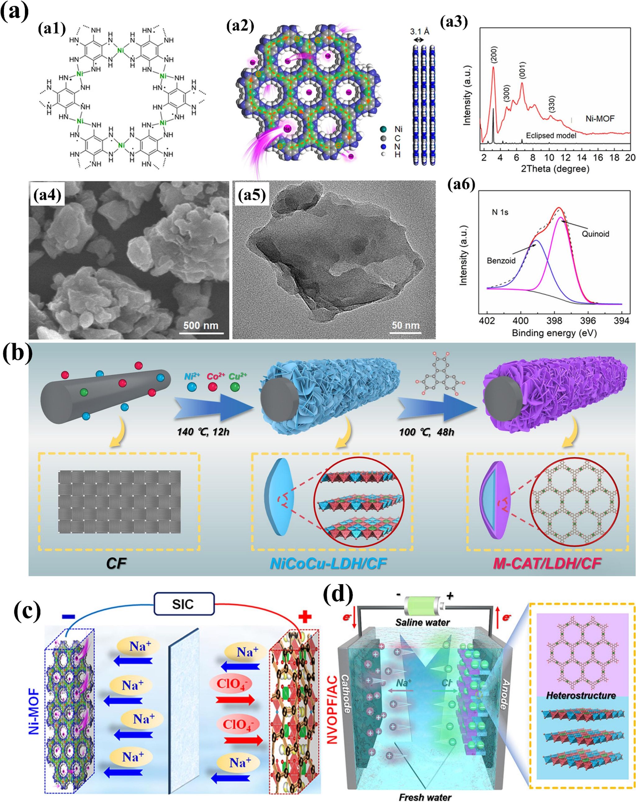 在电容去离子(CDI)领域,导电金属有机框架(C-MOFs)凭借其高比表面积、可调的孔道结构和优异的离子存储能力,成为极具前景的电极材料。CDI技术的核心在于通过电极的双电层吸附或赝电容反应来去除水中的盐离子,因此理想的CDI电极需要具备高电解质渗透性、快速的离子传输路径以及大的可用比表面积。C-MOFs恰好能满足这些要求:其高度有序的孔道可以作为离子传输的“高速公路”,缩短扩散路径并促进离子脱溶剂化,而其固有的(或通过复合赋予的)电子导电性则确保了外加电场下电荷的高效传输,这对于快速的吸附-脱附循环至关重要。