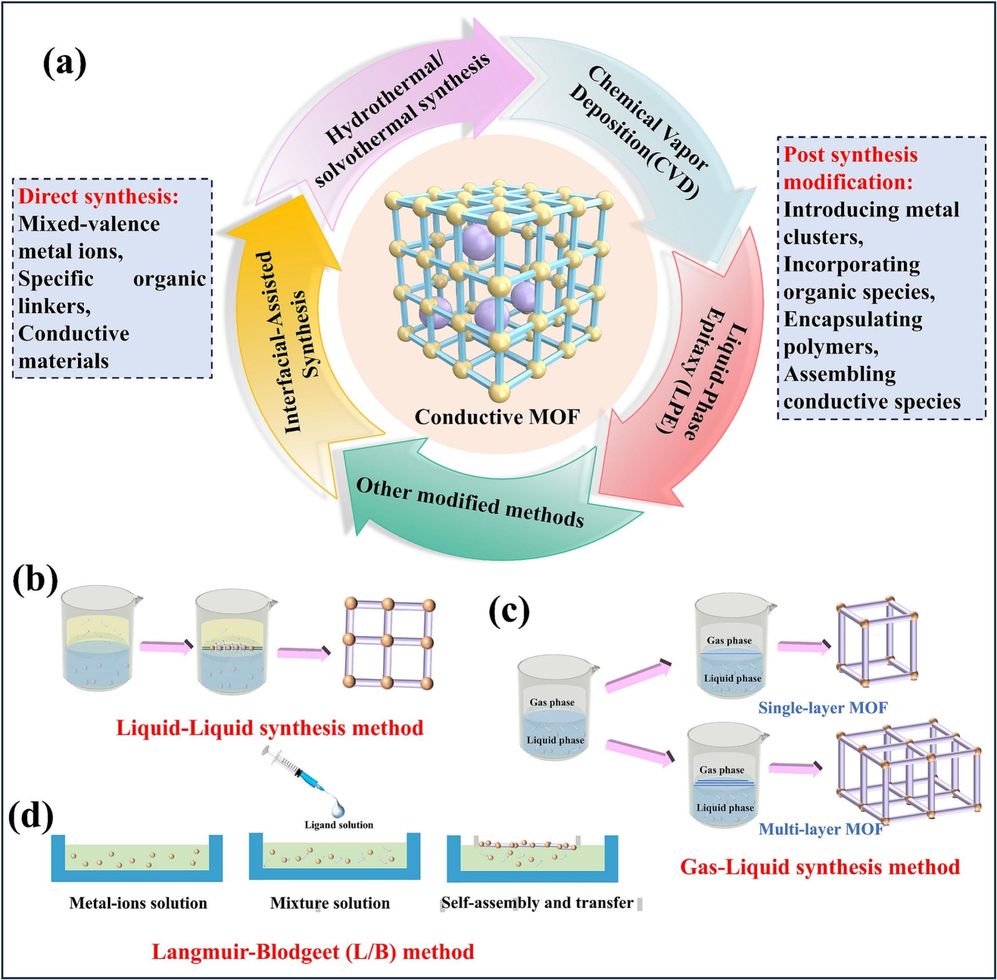 系统总结了提升MOFs导电性的各类合成方法与设计策略。主要分为共价与非共价两大途径:共价策略通过精选金属-配体对,利用其轨道强重叠和共价键形成本征导电路径;非共价策略则通过π-π堆叠或引入额外电荷转移来增强导电性。具体方法包括使用π共轭或含特定官能团(如-SH, -OH)的配体、选择具有混合价态的金属离子、构建二维或三维π堆叠结构、以及通过后合成修饰引入导电聚合物(如PPy, PANI)或其它导电客体。在合成技术方面,水热/溶剂热法是制备晶态块体材料的经典方法;界面辅助合成(如液-液、气-液界面)和Langmuir-Blodgett技术可用于制备高度有序的薄膜;化学气相沉积(CVD)能实现无溶剂、高质量的薄膜生长;液相外延(LPE)可精确控制薄膜厚度与取向;后合成修饰法则在保持MOF骨架的前提下,通过引入功能分子或复合材料来赋予或增强其导电性。这些策略共同为定制不同形态和性能的C-MOFs提供了丰富工具箱。