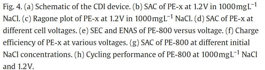 脱盐性能测试表明,PE-800电极在1.2 V工作电压下实现了99.09 mg g⁻¹的盐吸附容量。其在多种电压条件下均保持较高的脱盐效率,且随着电压提升,脱盐容量呈现稳定增长趋势。该电极在不同初始盐浓度条件下均表现出良好的适应性,经过多次循环后仍保持稳定的脱盐性能,容量保持率良好。同时,该电极在整个脱盐过程中表现出较低的能量消耗,体现了其在实际应用中的能效优势。这些性能特征与其独特的孔道结构和表面性质密切相关。