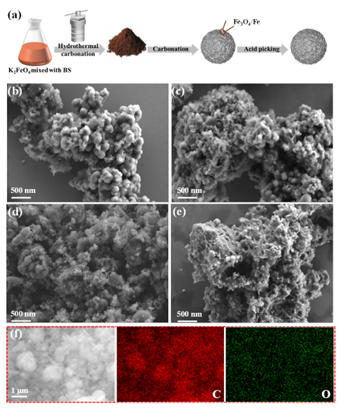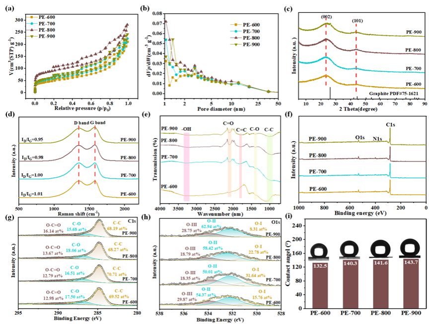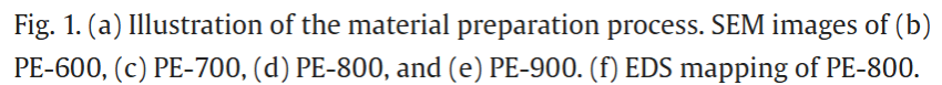 随着温度从600°C升至800°C,材料形貌由致密球状结构逐渐演化为三维多孔结构。PE-800样品呈现出典型的分级多孔特征,其相互连接的孔道结构有效促进了离子传输动力学。能谱分析证实酸洗处理后材料中无铁物种残留,确保了碳骨架的纯度。当温度达到900°C时,过度石墨化导致孔结构坍塌,证实了温度调控对维持多孔结构的重要性。