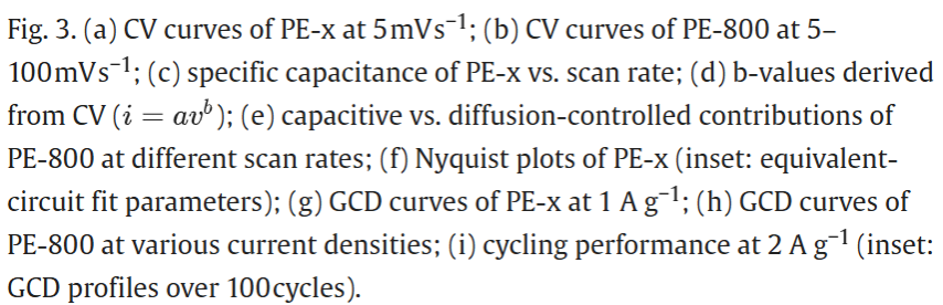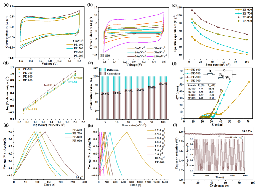 电化学测试结果显示PE-800电极具有理想的电容特性和反应动力学。其CV曲线呈现出良好的双电层行为,在不同扫描速率下均保持稳定的电化学响应。动力学分析表明该电极以表面扩散控制为主。阻抗测试显示其具有较低的电荷转移阻力和离子扩散阻抗,证实了优异的电子和离子传导性能。充放电曲线展现出高度对称的特征,经过多次循环后仍保持稳定的电容性能,体现了良好的结构稳定性和循环耐久性。