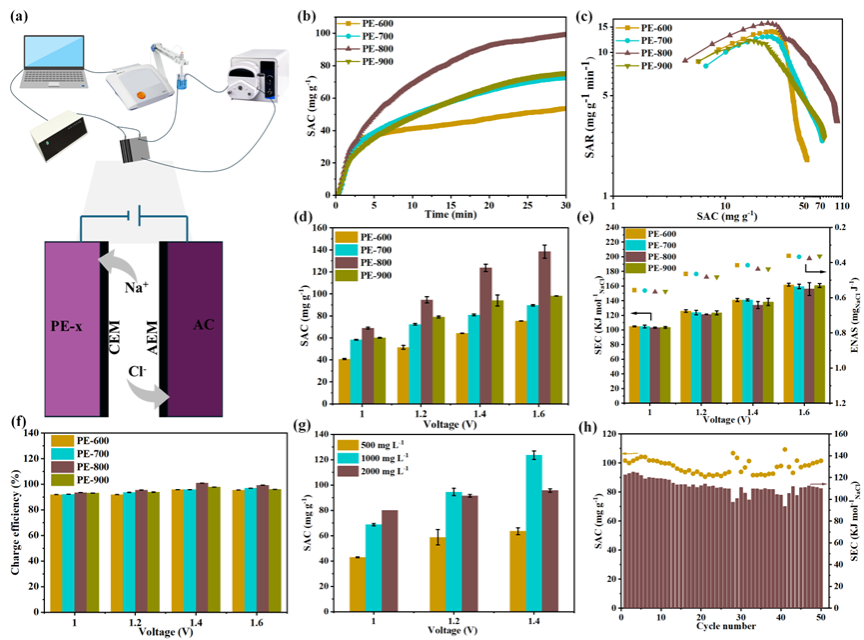 材料表征结果显示PE-800具有理想的结构特征:其发达的分级多孔系统以介孔为主导,为离子传输构建了高效通道;同时材料呈现出高度有序的石墨化骨架,为电子传递提供了快速路径。表面化学分析表明,材料在保持良好导电性的同时,具有适宜的官能团修饰,这种平衡状态既确保了电极的电荷存储能力,又促进了离子吸附过程。结构特征与表面性质的协同作用,使材料在保持良好导电性的同时兼具优异的离子传输性能,为高效电容脱盐应用奠定了坚实基础。