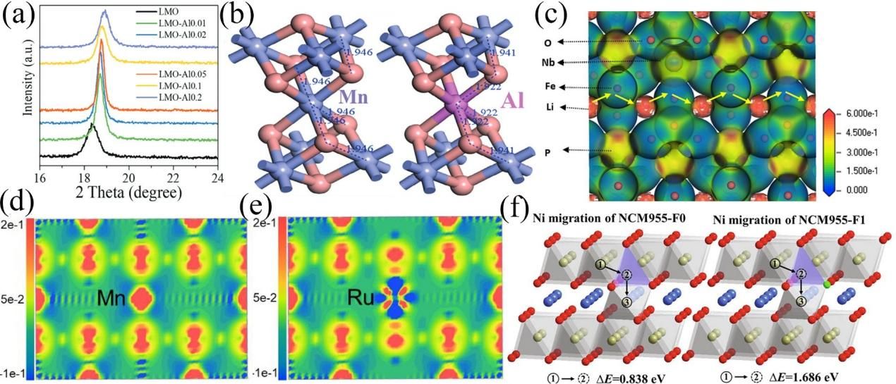 Figure 9. (a) Doping with Al atoms causes the XRD peak shift of LMO, (b) The site of Al atoms in the lattice after doping, (c) The electron localization function map of Nb-doped LFPO, the amount of electron localization around Nb atoms is smaller than that around Fe atoms, and the diffusion energy barrier is reduced. Charge density of LMO (d) and Ru dopped LMO (e). (f) Schematic diagram of Ni diffusion pathways in NCM955-F0 and NMC955-F1.