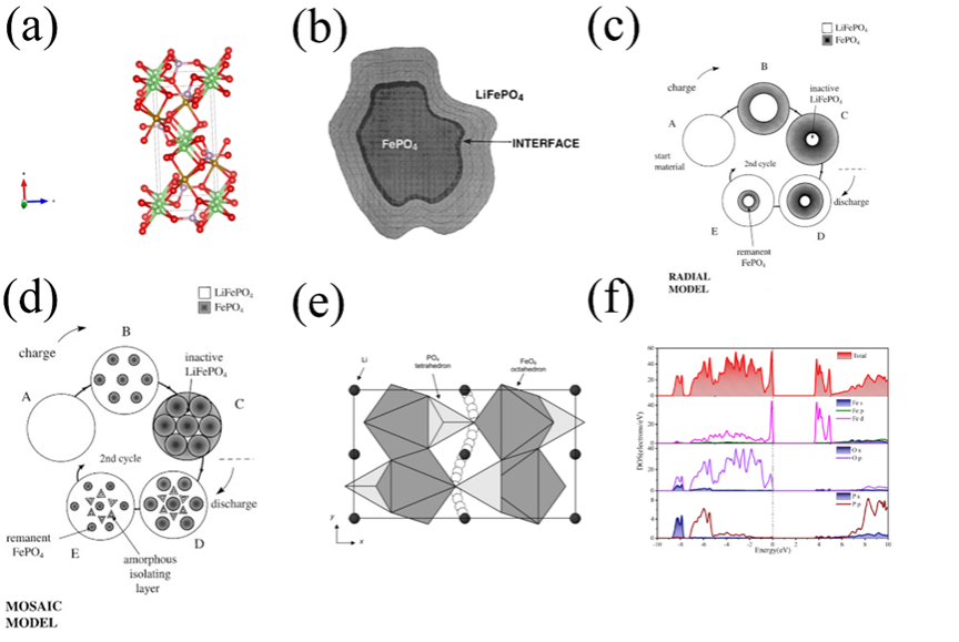 Figure5. (a)cell structure of olivine LiFePO4(red: O; brown: Fe; pink: P). Lithium iron phosphate phase transition model: (b)phase interface model, (c)core-shell model, (d)Mosaic model, (e)One-dimensional diffusion model, (f)Eigensystem state density of LFPO.