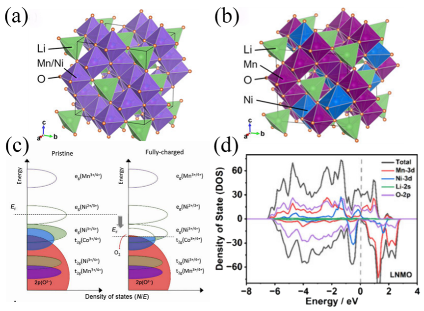 Figure4. The crystal structure of LNMO (a) disordered state, (b) ordered state. (c) Schematic representation of electronic configurations for Ni, Co, and Mn ions. The left panel depicts the ground state (uncharged), while the right panel illustrates the fully oxidized state. Electron occupancy is visualized through color-filled ellipses. (d) Density state of LNMO.
