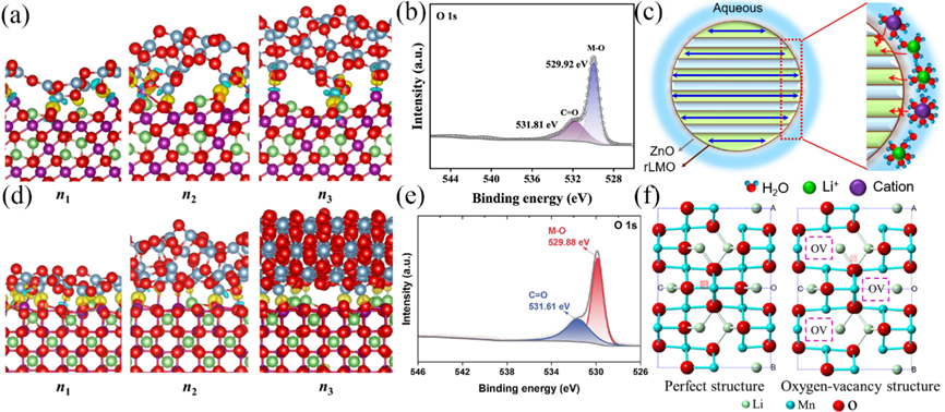 Figure 8. Differences in the interfacial structure and charge density of alumina-coated LMOs with different numbers of layers (n1, n2, n3) for {1132} configuration (a) and {3121} configuration (d), blue area indicates charge deficiency, yellow area indicates charge accumulation, purple ball indicates Mn, green indicates Li, light blue indicates Al . XPS analysis of the O1s orbitals of pure LMO (b), LMO after In2O3modified (e).(c) Dehydration of hydrated cations on ZnO-LMO surfaces and selective embedding in materials. (f) perfect structure and Oxygen-vacancy structure of LMO.