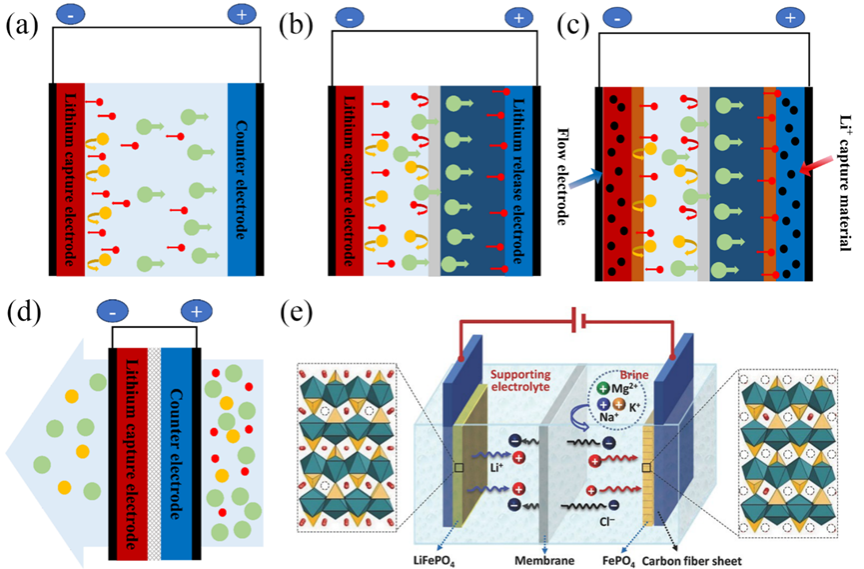 : lithium-enriched solution; (f) Schematic diagram of lithium extraction from CDI model of class battery (taking lithium iron phosphate as an example).