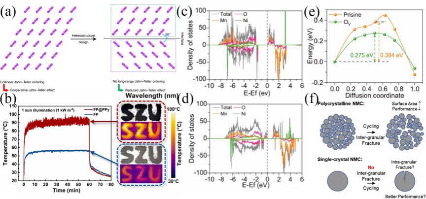 Figure 11. (a) Failure of the JT effect due to clamped orbitals. (b) Temperature changes of FP and FP@PPy under 1 sun simulation light. The inset on the right shows digital images and infrared thermal images. The density of states of LNMO-Pristine (c) and LNMO-OVs (d); (e) Comparison of lithium diffusion energy barrier curves for LNMO-Pristine and LNMO-OVs. (f) Different reactions at grain boundaries during cycling of polycrystalline and monocrystalline NCM.