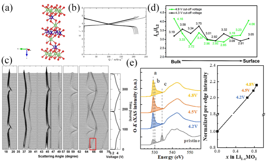 Figure6. (a)Crystal structure of NCM. (b)Charge and discharge curve of NCM. (c) Charge-discharge curves of NCM at 0.01C and in situ XRD. (d)The ratio of the L2 and L3 intensities of the L-edge electrons of Ni atoms as a function of atomic position. (e)K-edge sXAS spectra of O and the normalized intensity in pre-edge region.