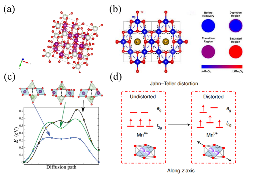 Figure3. (a) cell structure of spinel Li0.05Mn1.95O4(red: O, white: Li, purple: Mn), there is only 0.05 probability that lithium atoms will be present in the white sphere. (b) Changes in the length of Mn-O bonds in different regions during lithium insertion. (c) Energy barrier profiles of different diffusion paths in different sized crystallite. (d) the energy state split of valence electron orbital of manganese, and JT distortion.