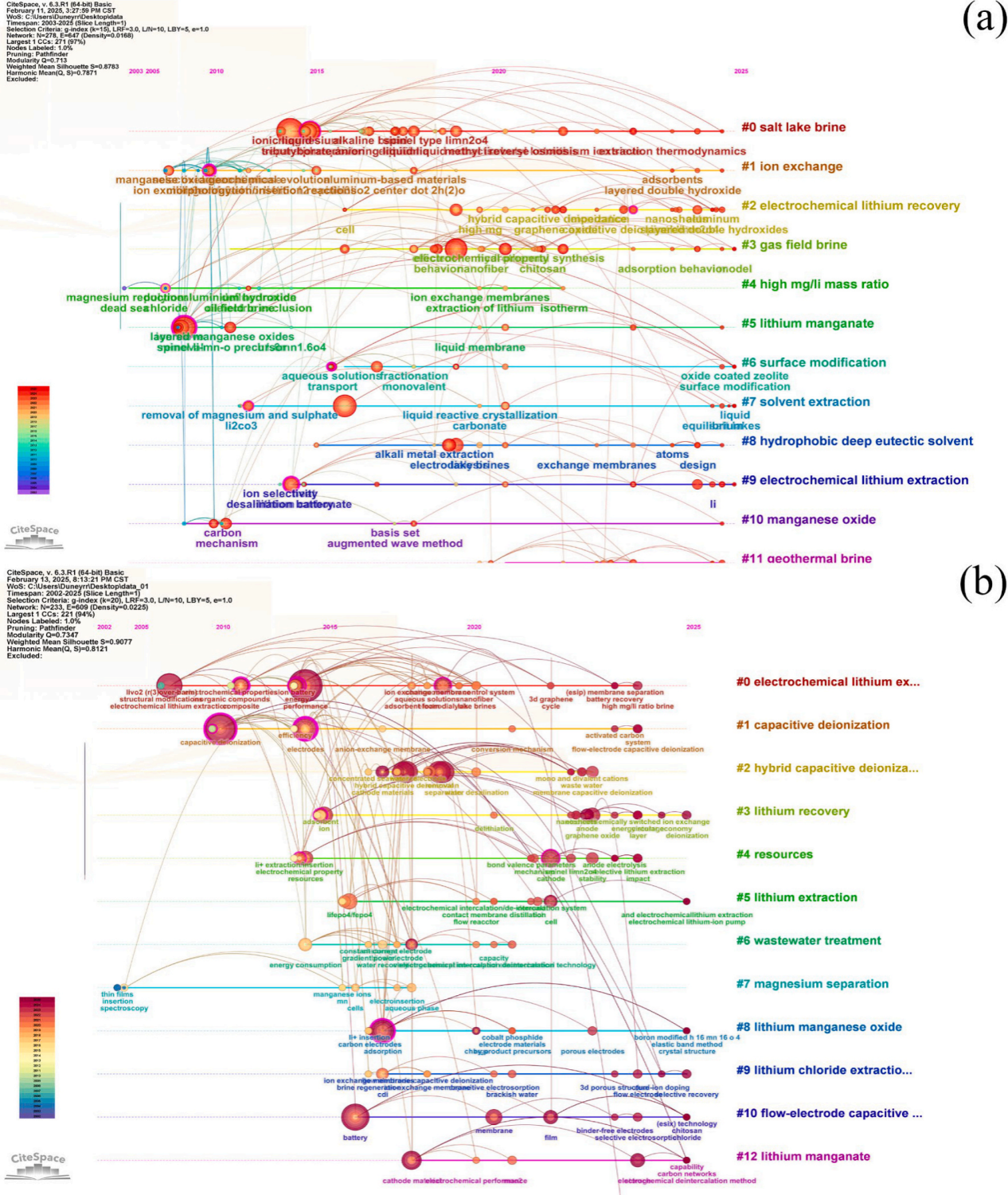 Figure1. (a) Research hotspots timeline (2002-2025) of lithium extraction from salt lakes searching in Web of Science Core Collection with keywords “brine” and “lithium extraction”, and (b) electrochemical lithium extraction searching with keywords “electrochemical” and “lithium extraction”