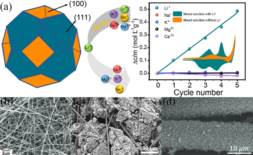 Figure 10. (a) The orientation of the chamfered octahedral LMO crystal surface and its selective lithium extraction performance. (b) SEM images of the synthesized single crystalline spinel LiMn2O4nanowires. (c) Morphology of PEG-modified porous LiFePO4electrode. (d) SEM images of LiMn2O4nanosheets.